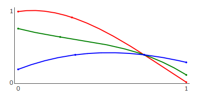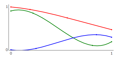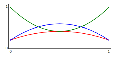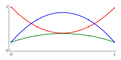\begin{equation} \vec{B}(t) = \sum_{i=0}^{n} \frac{n!}{i!(n-1)!} (1-t)^{n-i} t^i \vec{P}_i \\ \end{equation}